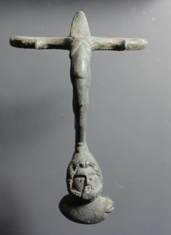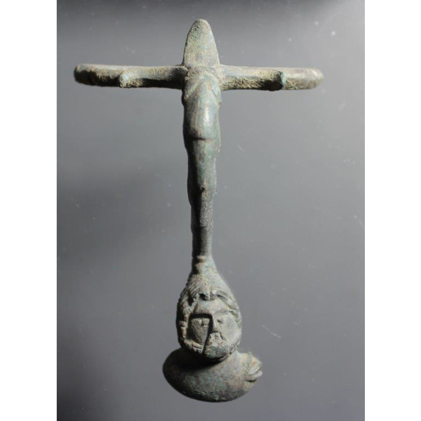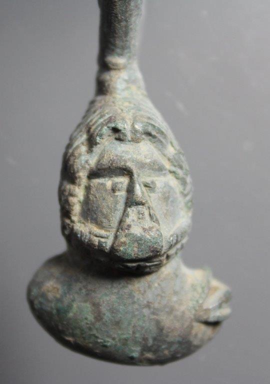 Henkelattasche mit Büste des bärtigen Jupiter, Bronze, Dm. 9,5 x 6,3 cm. Römische Kaiserzeit, 2.-3. Jhdt. n. Chr. Provenienz: Ex-Slg. Lord McAlpine of West Green, erworben Kunstmarkt London, 2019
